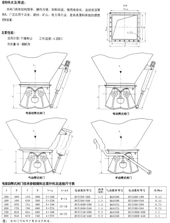 采用帶有_載保護裝置的電動推桿,可避免燒壞電機,可以遠距離操縱或程序控制,往復行程可以調節位置自鎖。電液動式閘門采用電液推桿,全液壓傳動,推拉力均可實現無級調速。氣動式閘門采用氣動推桿,通過配件組合可以遠距離操縱或現場控制。