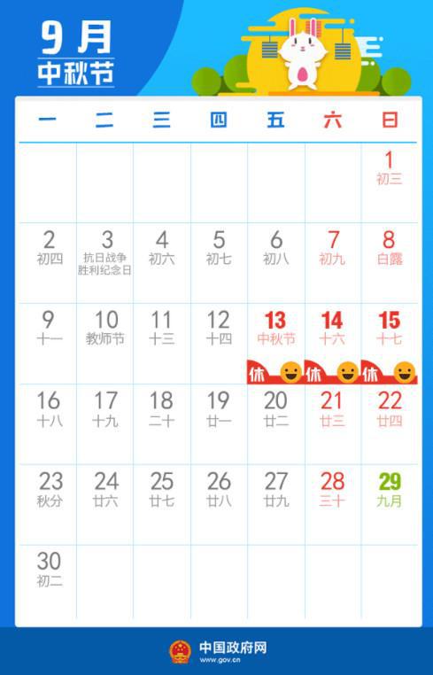9月13日(星期五)放假調(diào)休,與周末連休
